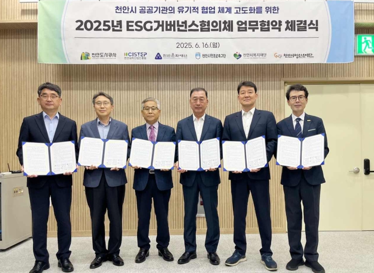 이번 협약은 ESG경영실무자협의체의 명칭을 ‘ESG거버넌스협의체’로 변경하고, 협의체 참여 기관을 기존 공사와 천안문화재단, 천안시복지재단, 천안과학산업진흥원에서 천안시청소년재단과 천안시민프로축구단까지 확대해 ESG협력 체계를 체계적이고 지속가능한 방식으로 발전시키기 위해 마련됐다.