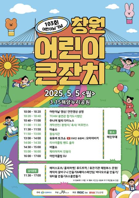 [무한뉴스=최진수 기자] 창원특례시는 오는 5월 5일 ‘제103회 어린이날’을 맞아 3.15해양누리공원에서 ‘창원 어린이 큰잔치’를 개최한다고 밝혔다.
