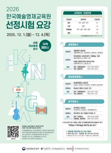 [무한뉴스=정민정 기자] 광주광역시는 한국예술종합학교 부설기관인 한국예술영재교육원 광주캠퍼스의 2026년도 교육생을 오는 12월 1일부터 4일까지 모집한다고 13일 밝혔다.