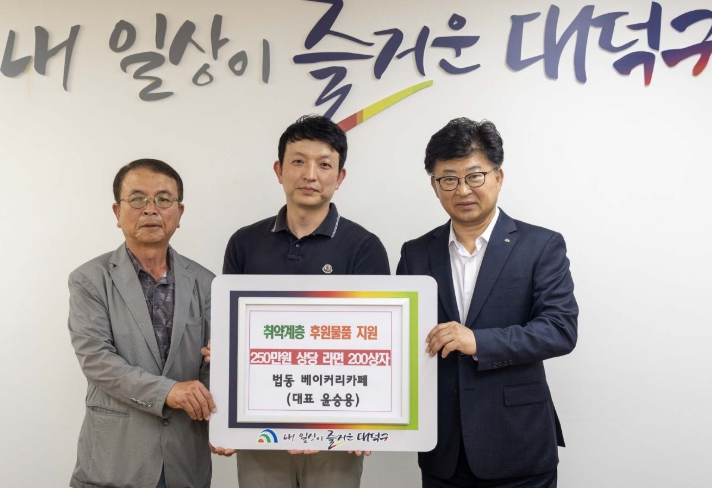 [무한뉴스=정민정 기자] 대전 대덕구는 법동 소류지 인근 베이커리카페(대표 윤승용)로부터 250만원 상당의 라면 200상자를 기탁받았다고 밝혔다.