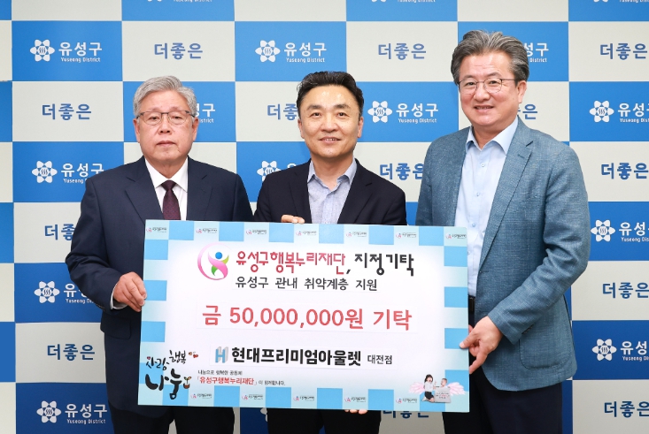 [무한뉴스=정민정 기자] 대전 유성구는 30일 현대프리미엄아울렛 대전점(상무 장필규)이 유성구행복누리재단에 후원금 5,000만 원을 기탁했다고 밝혔다.