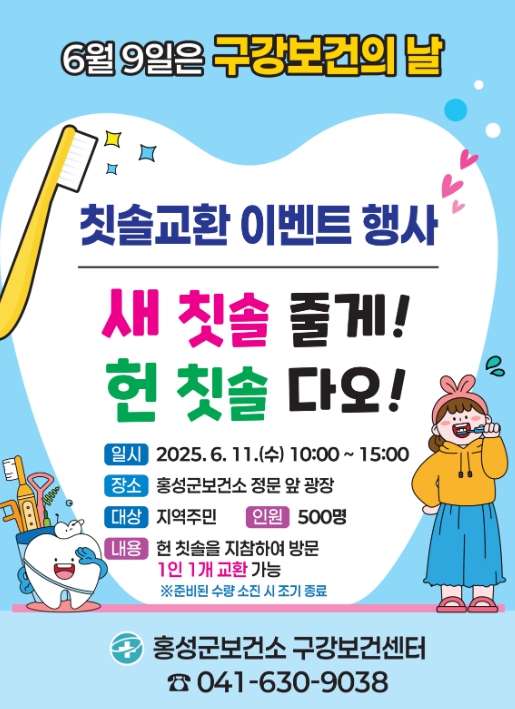 [무한뉴스=정민정 기자] 홍성군보건소는 제80회 구강보건의 날(6월9일)을 기념하여 구강 건강의 중요성과 올바른 칫솔 교체 시기를 알리고 지역주민의 구강건강 인식 향상과 실천을 위해 ‘새 칫솔 줄게! 헌 칫솔 다오!’ 칫솔교환 행사를 실시한다고 밝혔다.