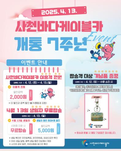[무한뉴스=최진수 기자] 사천시시설관리공단은 오는 4월 13일, 사천바다케이블카 개통 7주년을 맞아 할인 및 기념품 증정 이벤트를 실시한다.