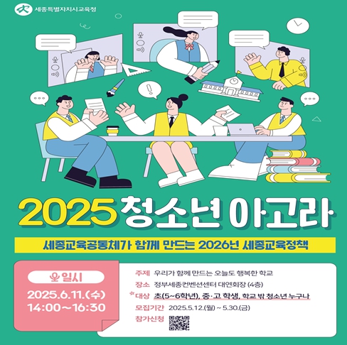 [무한뉴스=정민정 기자] 세종특별자치시교육청은 6월 11일 오후 2시에 정부세종컨벤션센터 4층 대연회장에서 ‘2025년 청소년 아고라’를 개최한다.