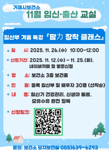 [무한뉴스=최진수 기자] 거제시보건소는 오는 11월 26일 오전 10시부터 12시까지 보건소 3층 보건홀에서 '맘力 장착 클래스' 겨울 특강을 개최한다. 지역 내 임산부와 배우자를 대상으로 하며, 11월 12일부터 네이버 카페 또는 모자보건실 방문을 통해 신청할 수 있다.