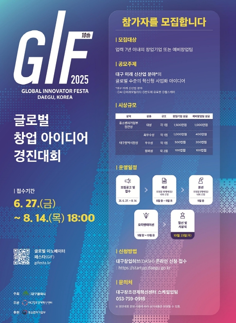 [무한뉴스=최진수 기자] 대구광역시는 혁신 창업 아이디어를 보유한 유망 창업기업 및 예비창업자를 발굴하기 위한 2025 글로벌 이노베이터 페스타(GIF 2025) ‘글로벌 창업 아이디어 경진대회’ 참가자를 6월 27일부터 8월 14일까지 모집한다.