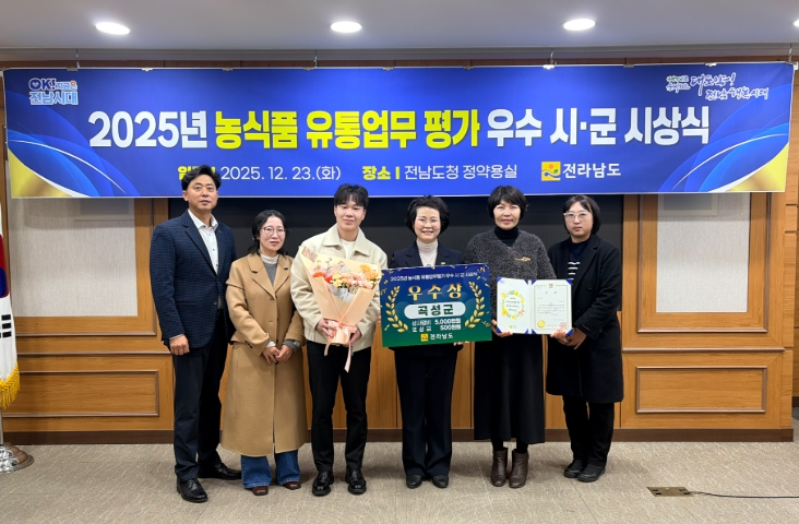 [무한뉴스=정민정 기자] 곡성군수는 전라남도가 주관한 ‘2025년 농식품 유통업무 우수 시‧군 평가’에서‘우수상’을 수상했다고 23일 밝혔다. 군은 전년도에 동일 평가에서 ‘최우수상’을 받은 경력이 있으며, 이번 수상으로 농식품 유통업무 우수 지자체로서의 입지를 다졌다.