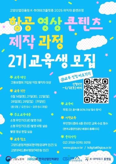 [무한뉴스=정승훈 기자] 고양산업진흥원 K-하이테크 플랫폼 지원단에서는 고용보험 가입자를 대상으로 드론 운용 및 영상 편집 실무를 교육하는 ‘항공 영상 콘텐츠 제작 과정’ 2기를 운영한다.