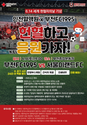 [무한뉴스=정승훈 기자] 대한적십자사 인천혈액원(원장 김영섭)은 오는 6월 14일 ‘세계 헌혈자의 날’을 맞아, 부천종합운동장에서 열리는 부천FC 홈경기와 연계한 특별 헌혈자 초청 행사를 개최한다고 밝혔다.