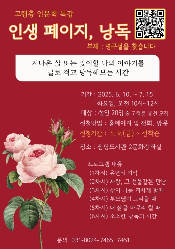 '인생 페이지, 낭독' 인문학 특강은 ‘지나온 또는 맞이할 삶에 대한 나의 이야기’를 글로 적어보고 낭독하는 프로그램으로, 오는 6월 10일부터 7월 15일까지 매주 화요일 오전 10시부터 12시까지 장당도서관 2문화강좌실에서 운영된다. 총 6회 수업으로 나이에 상관없이 성인이면 누구나 참여할 수 있으며 특히 노령층의 참여를 기대하고 있다.