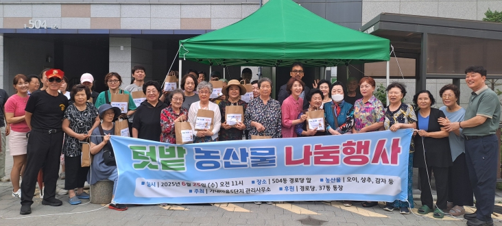 이번 행사는 아파트 내 텃밭에서 경로당 회원들이 정성껏 기른 고추, 상추, 감자 등 다양한 농산물을 주민들과 나누며 지역 공동체의 화합을 도모하기 위해 마련됐다. 행사에는 100여 명의 아파트 입주민이 참여해 따뜻한 나눔의 시간을 가졌다.