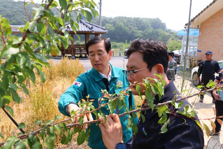 | ▲ 조길형충주시장 우박 피해 현장방문2(복숭아나무 점검) |