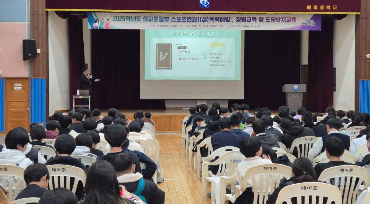 [무한뉴스=정민정 기자] 충청남도서산교육지원청은 지난 28일, 해미중학교 체육관과 해미도서관에서 학생선수, 운동부 지도교사, 운동부 지도자, 전문스포츠지도자를 대상으로 한 '2025학년도 학교운동부 스포츠인권((성)폭력예방), 청렴교육 및 도핑방지교육'을 실시했다.