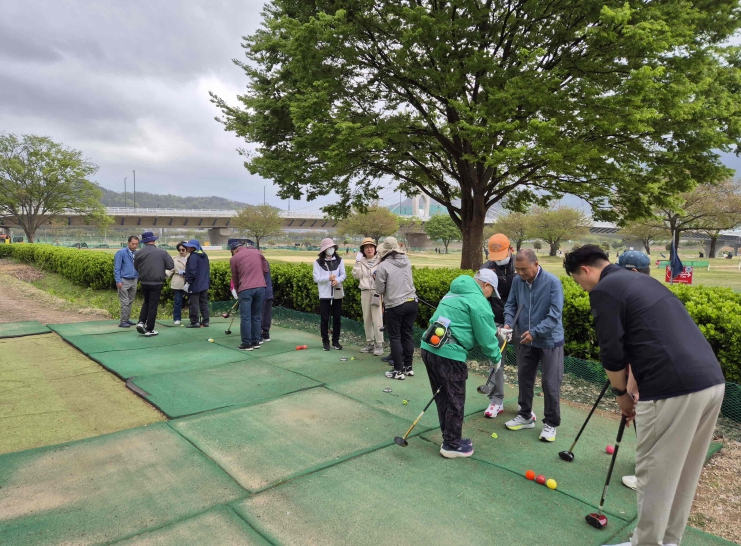 ▲ 파크골프 교육 참여자들이 밀양파크골프장에서 기초 교육을 받고 있다. |
