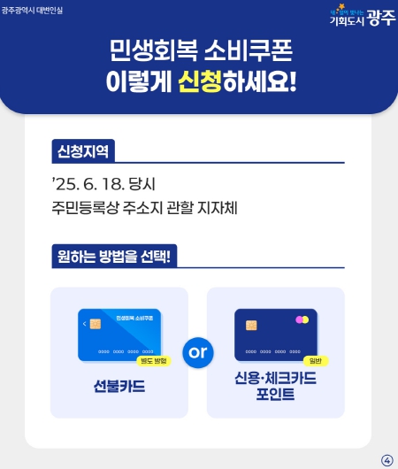 [무한뉴스=정민정 기자] 광주광역시는 민생경제 회복과 지역 골목상권 활성화를 위해 마련한 ‘민생회복 소비쿠폰’ 신청을 21일부터 시작한다.