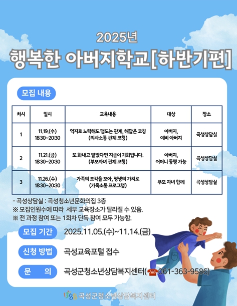 [무한뉴스=정민정 기자] 곡성군청소년상담복지센터가 지역 사회 아버지들(지역 청년회 등)의 요구 분석을 통해 가족 내 소통 역량 증진을 위한 부모교육 프로그램 ‘행복한 아버지학교’ 제10기 참가자를 모집한다고 10일 밝혔다.