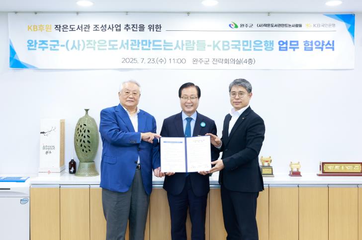 23일 완주군은 군청 전략회의실에서 KB국민은행, (사)작은도서관만드는사람들과 함께 ‘구이모악 작은도서관 이전·조성을 위한 업무협약’을 체결했다.