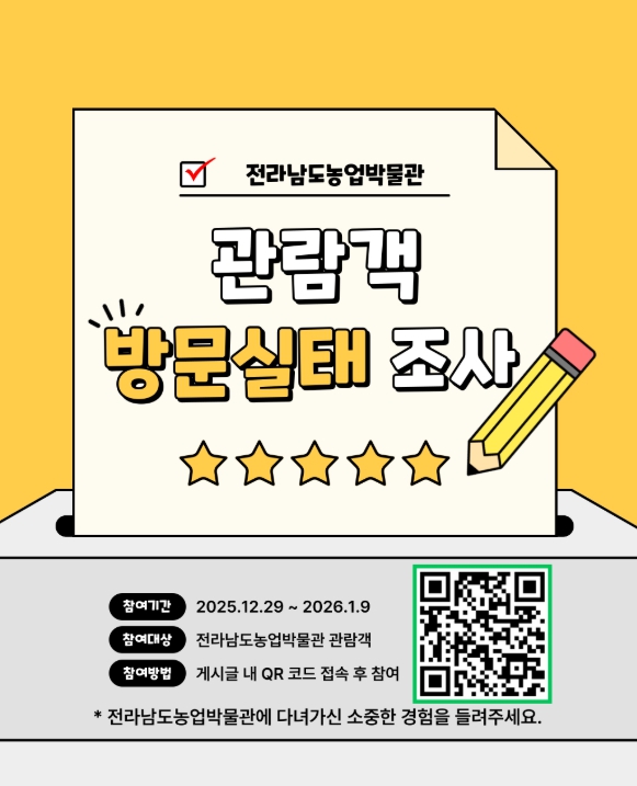 설문조사는 농업박물관 대표 누리집 접속해 온라인으로 참여하거나, 박물관 내 비치된 안내 유인물의 QR 코드를 스캔해 모바일로 참여할 수 있다.