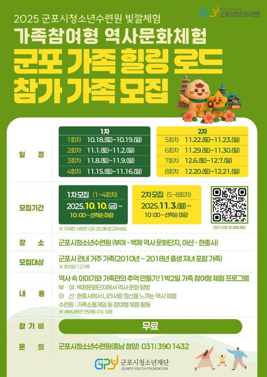 [무한뉴스=손성기 기자] 군포시청소년재단이 운영하는 군포시청소년수련원(충남 청양)은 관내 가족을 대상으로 2025년 가족참여형 역사문화탐방 '군포가족 힐링로드' 참가자를 모집한다.