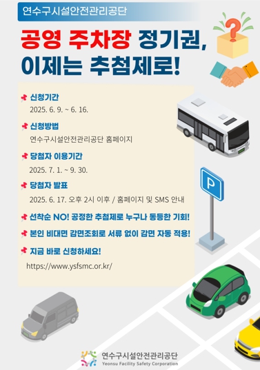 [무한뉴스=정승훈 기자] 연수구시설안전관리공단은 공영주차장 월 정기권 운영 방식을 기존 선착순 배정에서 온라인 무작위 추첨제로 전면 전환한다고 밝혔다.