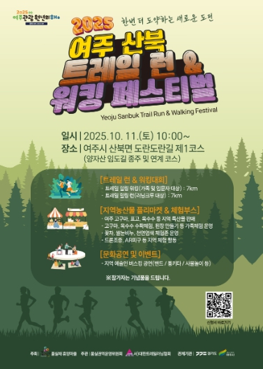 오는 10월 11일, 여주시 산북면 양자산 임도와 품실채 농촌체험휴양마을일대에서 ‘여주산북 트레일 런&워킹 페스티벌’을 개최한다.