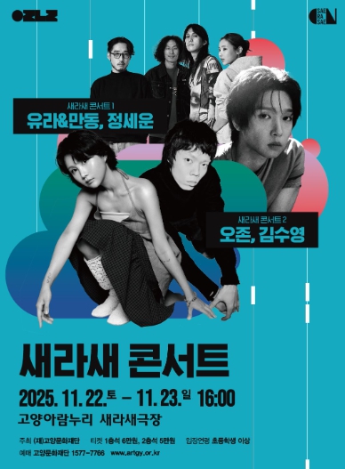 [무한뉴스=정승훈 기자] (재)고양문화재단은 소극장 기획공연 시리즈 ‘2025 새라새 ON 시리즈’의 11월 프로그램으로, 감각적인 싱어송라이터들을 만날 수 있는 '새라새 콘서트 1~2'를 11월 22일과 23일 양일간 고양아람누리 새라새극장에서 개최한다.