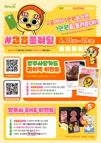 스티커가 부착된 상점에서 5만 원 이상 구매하면 1만 원 상당의 ‘양주사랑카드’가 지급되며 ‘별산 병따개’를 찍은 사진을 인스타그램에 ‘#고읍플러팅’ 해시태그와 함께 올리면 ▲한우 선물세트, ▲양주골쌀 등 지역 특산물 경품 추첨 이벤트에도 참여할 수 있다.