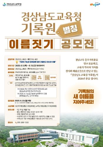 [무한뉴스=정승훈 기자] 경상남도교육청은 2026년 개원을 앞둔 ‘경상남도교육청 기록원’의 공식 별칭을 선정하기 위해 이름짓기 공모전을 5일부터 13일까지 진행한다.