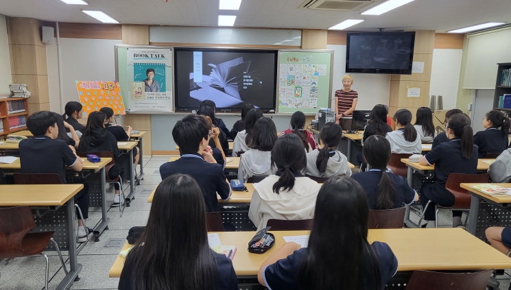 | ▲ ‘솔라의 정원’ 김혜정 작가가 천안지역 학교에 방문해 청소년들과 소통하고 있다. |