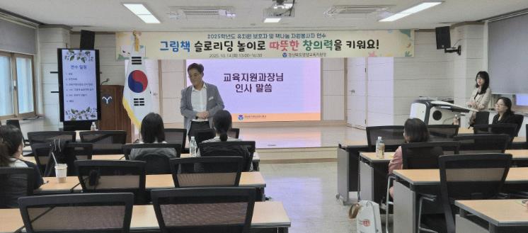 [무한뉴스=최진수 기자] 경상북도영양교육지원청은 2025년 10월 14일 영양교육지원청 대회의실에서 ‘그림책 슬로리딩 놀이로 따뜻한 창의력을 키워요’라는 주제로 관내 유치원, 어린이집 및 초등 1, 2학년 학생과 학부모를 대상으로 2025 유치원·초등 저학년 보호자 및 책나눔 자원봉사자 연수를 개최했다.