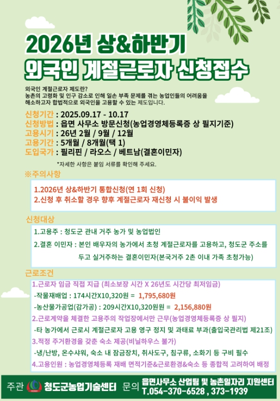 [무한뉴스=최진수 기자] 청도군은 농촌 인구감소와 고령화로 인한 농번기 일손 부족 문제 해소를 위해 9월 17일부터 10월 17일까지 '2026년 상·하반기 외국인 계절근로자' 고용 희망농가 수요조사를 실시하고 있다.