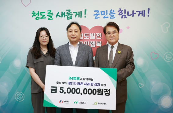 IM뱅크 청도지점 오창용 지점장은 “명절 준비에 어려움을 겪는 이웃들에게 조금이나마 보탬이 되고자 이번 나눔에 동참하게 되었으며, 앞으로도 다양한 사회공헌 활동을 통한 지역사회와 상생의 길을 모색하겠다”고 말했다.