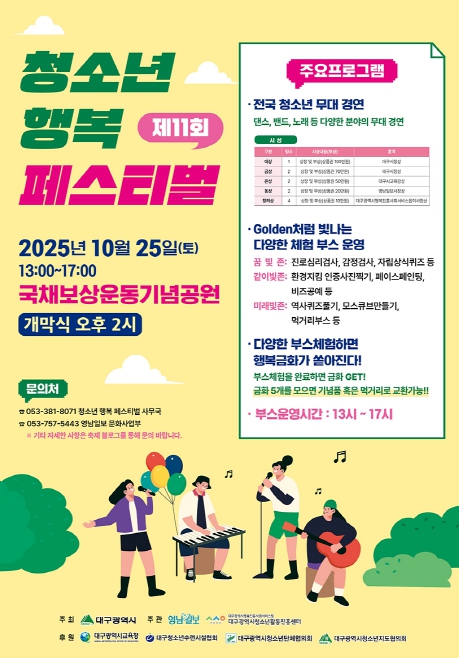 [무한뉴스=최진수 기자] 대구광역시는 10월 25일 오후 2시, 국채보상운동기념공원에서 ‘2025년 제11회 청소년 행복 페스티벌’을 개최한다.