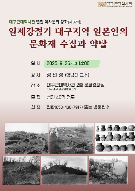 [무한뉴스=최진수 기자] (재)대구문화예술진흥원 박물관운영본부 소속 대구근대역사관은 광복 80주년 기념 연속 특강으로, 9월 26일 ‘일제강점기 대구지역 일본인의 문화재 수집과 약탈’을 주제로 제37회 열린 역사 문화 강좌를 개최하며 참가자를 모집한다.
