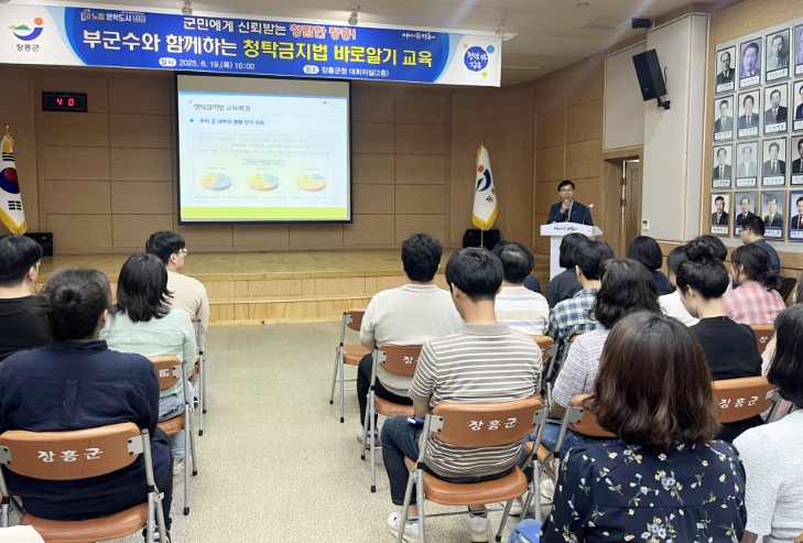 [무한뉴스=정민정 기자] 장흥군이 19일 재직 5년 이상의 7급~8급 공무원들을 대상으로 ‘청탁금지법 바로알기 교육’을 실시했다고 밝혔다.