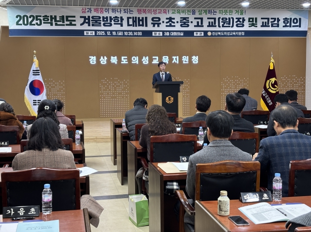 [무한뉴스=최진수 기자] 경상북도의성교육지원청은 12월 19일 의성교육지원청 3층 대회의실에서 '2025학년도 겨울방학 대비 유·초·중·고 교(원)장 및 교감 회의'를 개최하여 겨울방학 중 학생 안전을 확보하고 교육과정 마무리 및 새 학년도 준비 방향을 함께 모색하는 시간을 가졌다. 이번 회의는 ‘삶과 배움이 하나 되는 의성교육! 교육비전을 설계하는 따뜻한 겨울!’이라는 슬로건 아래, 학교 현장의 요구를 반영한 실질적인 협의에 중점을 두고 운영됐다.