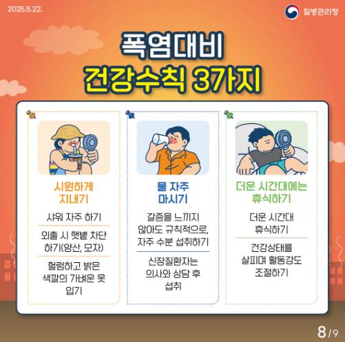 준수해야 할 예방수칙으로는 ▲외출 시 양산이나 모자를 이용해 햇볕을 차단하기 ▲헐렁하고 밝은 색상의 가벼운 옷 입기 ▲샤워를 자주 해 체온 낮추기 ▲갈증을 느끼지 않아도 규칙적으로 수분 섭취하기(단, 신장질환자는 의사와 상담 후 섭취) ▲낮 12시부터 오후 5시까지 더운 시간대에는 야외 활동 자제하기 ▲그늘에서 짧은 휴식 자주 취하기 ▲축사·비닐하우스 등 고온 환경은 환기하거나 물을 뿌려 온도 낮추기 ▲어르신이나 치매·심혈관질환 등 기저질환자의 건강 상태 수시 확인하기 등을 제시했다.