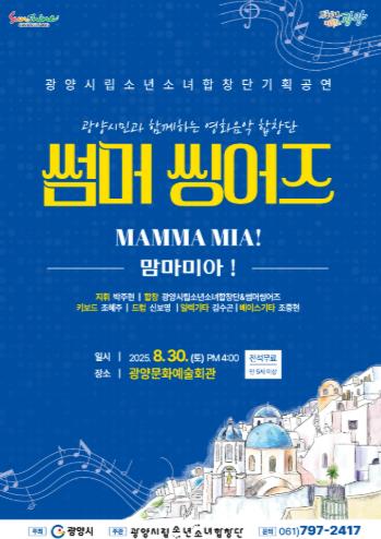 [무한뉴스=정민정 기자] 광양시립소년소녀합창단이 여름방학을 맞아 오는 8월 30일 오후 4시 광양문화예술회관 대공연장에서 기획공연 ‘썸머씽어즈–맘마미아!’를 선보인다.