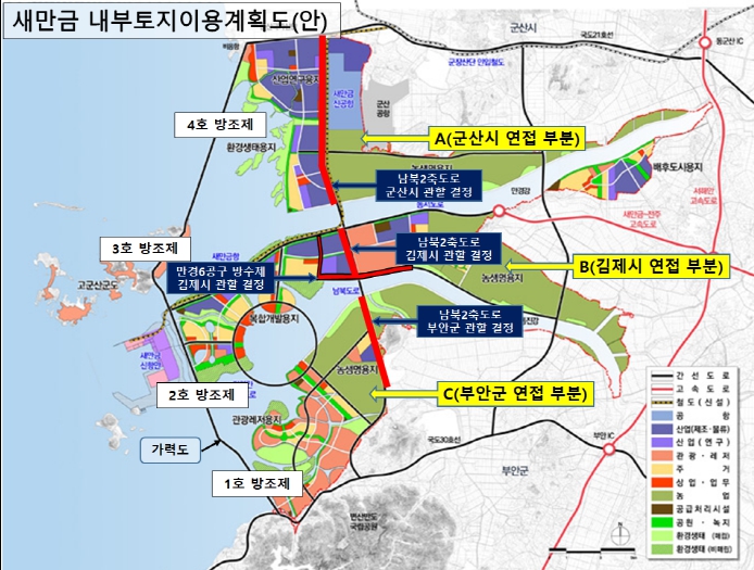 또, 남북2축도로는 새만금 중심부를 종단하는 왕복 6~8차선, 총연장 27.1㎞의 간선도로로 2023년 7월에 전 구간이 개통됐다. 지난 6월 제3차 중앙분쟁조정위원회에 상정돼, 이번 제4차 회의에서 각 시군 연접 구간별로 관할이 최종 결정됐다.
