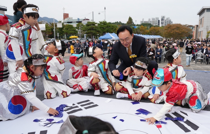 | ▲ 윤병태 시장과 아이들이 태극기 만들기 체험을 함께하고 있다 |