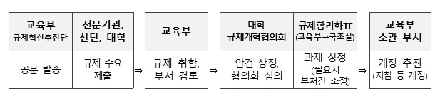 교육부는 각 부서에 분산되어 있는 지원 사업의 규제를 아우를 수 있도록 대학 규제혁신의 통합 관리 과정(프로세스)을 적용할 계획이다. 민관 협업 방식의 대학 현장 전문가 협의체인 ‘대학규제개혁협의회’ 통해 개선 과제를 발굴·심의하고, 교육부 차관 주재 규제 합리화 특별팀(TF)을 활용하여 과제의 개선 방안을 마련하는 등 과제의 발굴·검토·개정까지 단일 체계로 관리한다.