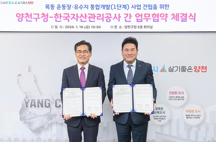 [무한뉴스=정승훈 기자] 양천구가 1월 16일 한국자산관리공사와 업무협약을 체결하며, 목동운동장·유수지 일대 통합개발(목동MICE)을 위한 첫걸음을 내디뎠다.