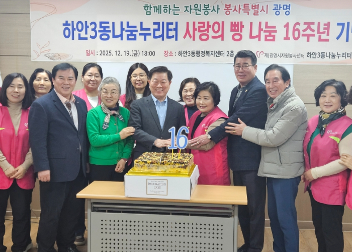 [무한뉴스=정승훈 기자] 광명시 하안3동 나눔누리터는 광명시자원봉사센터, 하안3동 행정복지센터와 함께 지난 19일 하안3동 행정복지센터 2층 회의실에서 ‘사랑의 빵 나눔’ 16주년 기념식을 개최했다.