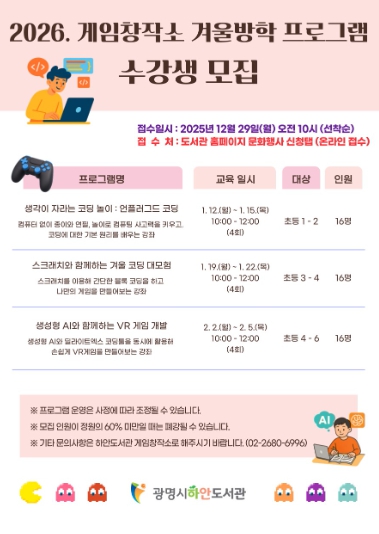 | ▲ 2026 게임창작소 겨울방학 프로그램 수강생 모집 안내문. |