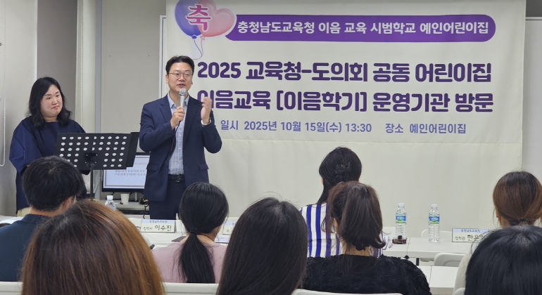 이번 방문은 충남교육청 2025 어린이집 이음교육(이음학기) 시범 운영 기관인 예인어린이집의 실제 운영 사례를 공유하고 현장과의 소통을 통한 맞춤형 지원 방안을 마련하기 위해 추진됐다.