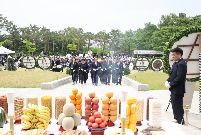 추념식은 오전 10시 정각 사이렌 울림과 동시에 호국용사, 순국선열을 기리는 묵념을 시작으로 헌화와 분향, 추념사·헌시 낭독, 현충일 노래 제창 순으로 진행됐다.