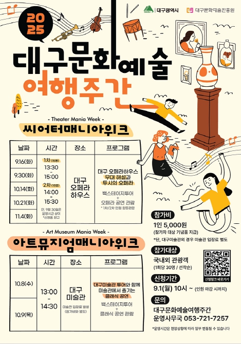 ‘대구문화예술여행주간’은 가을을 맞아 대구를 찾는 관광객들 및 문화예술을 사랑하는 모두에게 새로운 여행경험을 선사하는 특별기획상품으로 대구의 대표적인 문화예술과 관광을 접목시킨 새로운 컨셉의 여행프로그램이다.