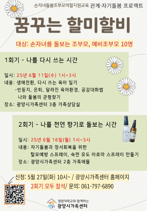 ‘꿈꾸는 할미할비’ 프로그램 관련 문의 및 참여 신청은 광양시가족센터 홈페이지 또는 전화를 통해 가능하다.