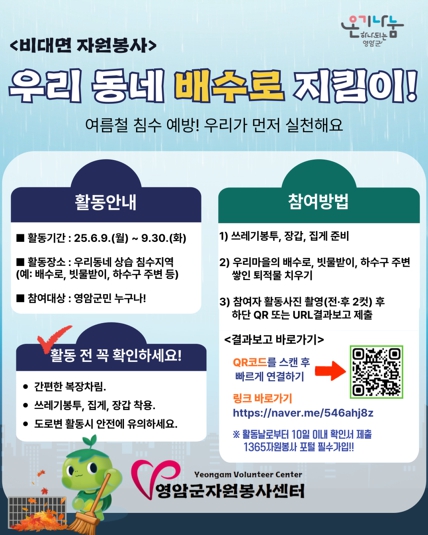 영암군자원봉사센터가 9월 말까지 ‘우리 동네 배수로 지킴이 캠페인’을 진행한다.
