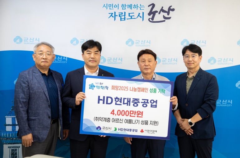 [무한뉴스=정민정 기자] HD현대중공업(대표이사 이상균·노진율)이 25일, 혹서기 취약계층의 건강한 여름나기를 지원하고자 4,000만 원 상당의 여름나기 선풍기와 보양식 꾸러미를 군산시에 전달했다.